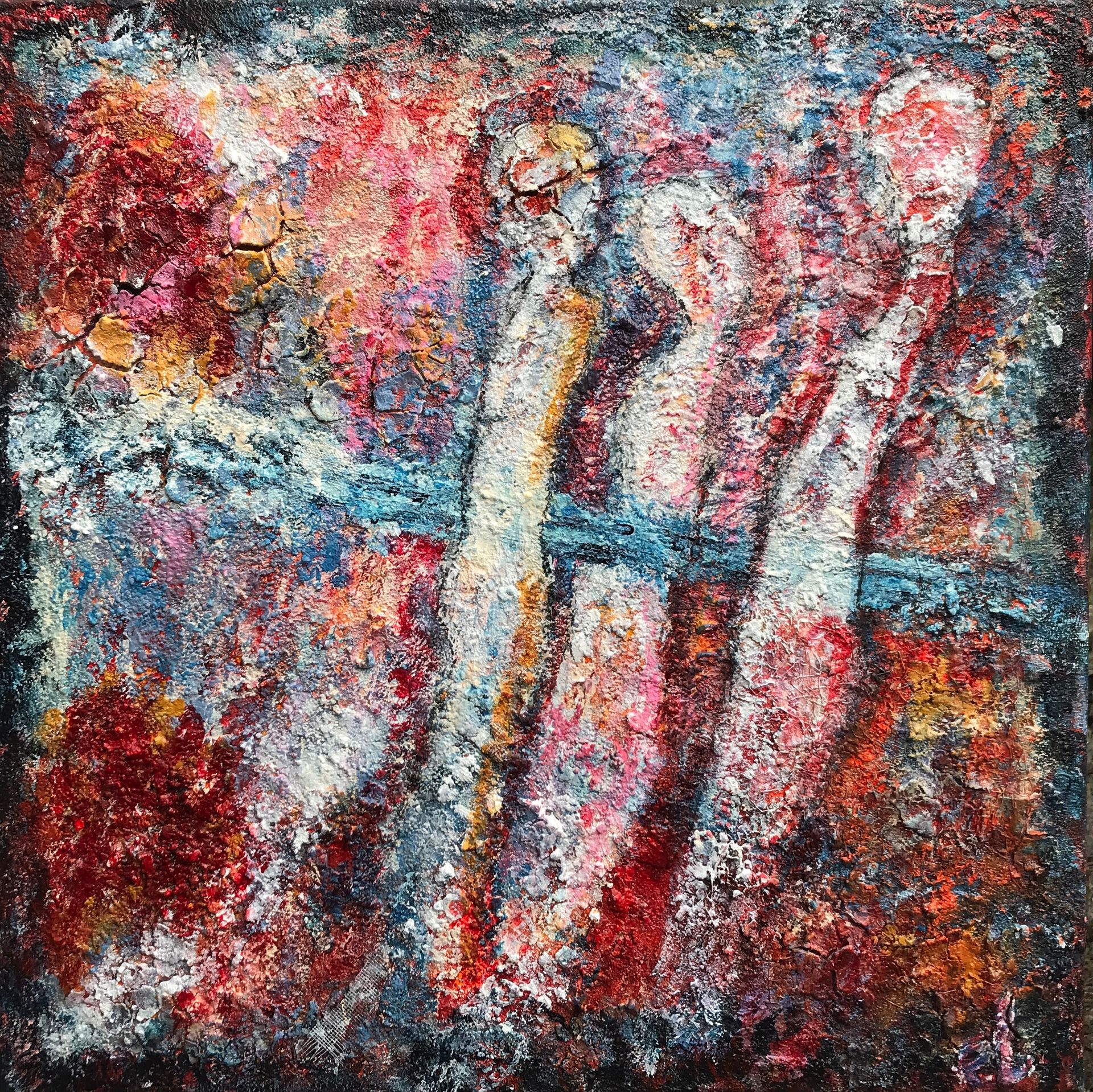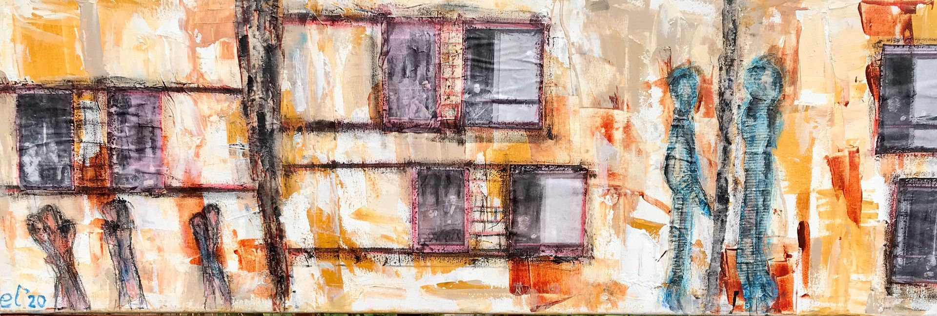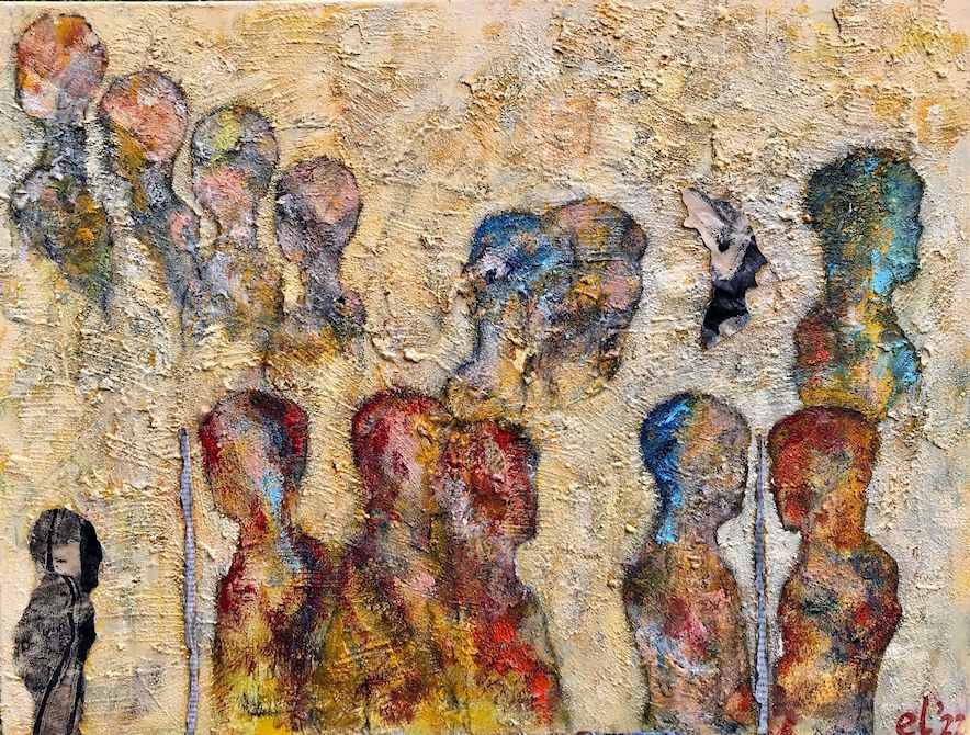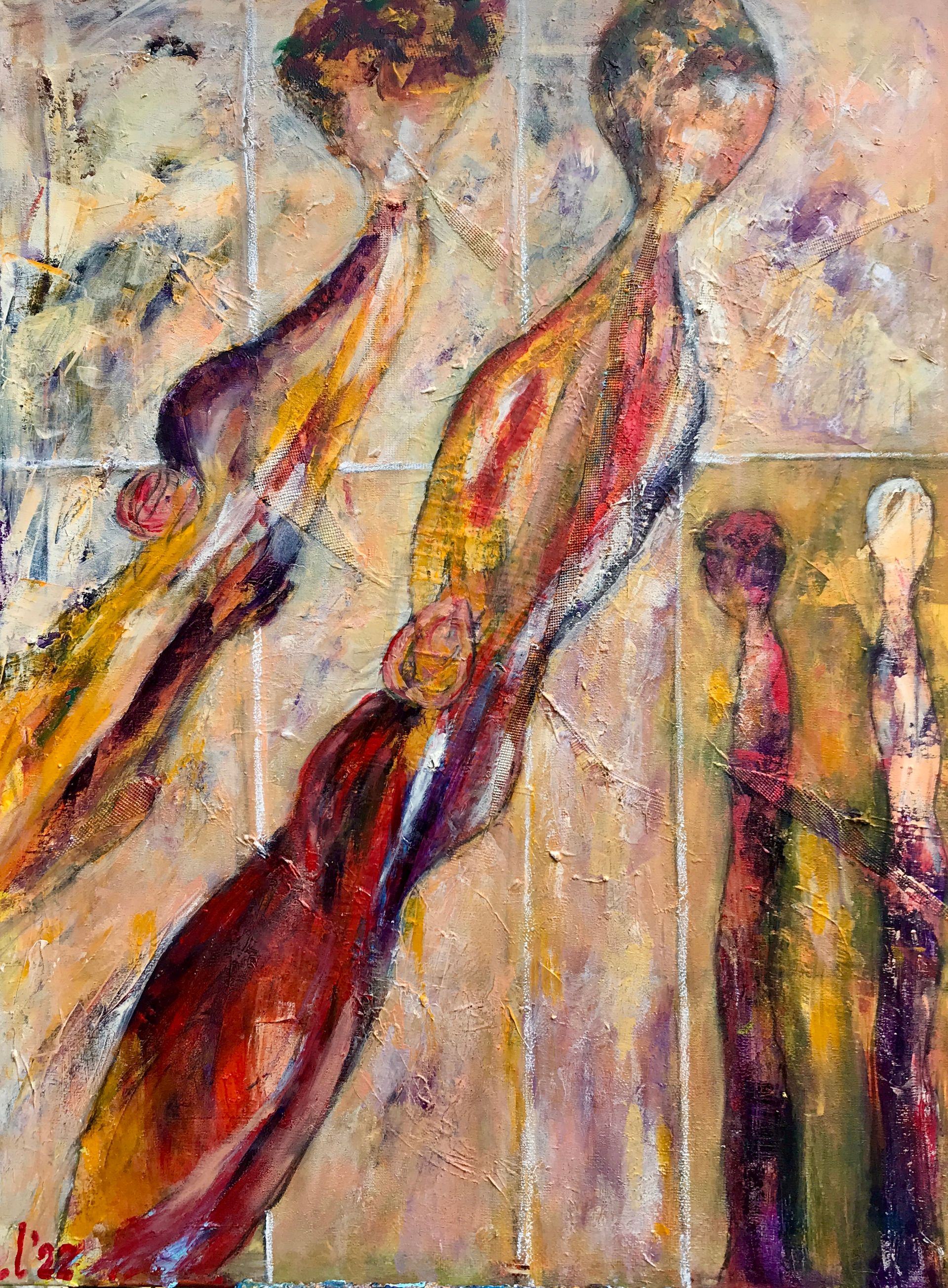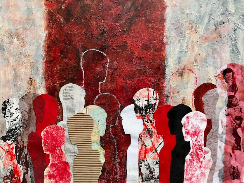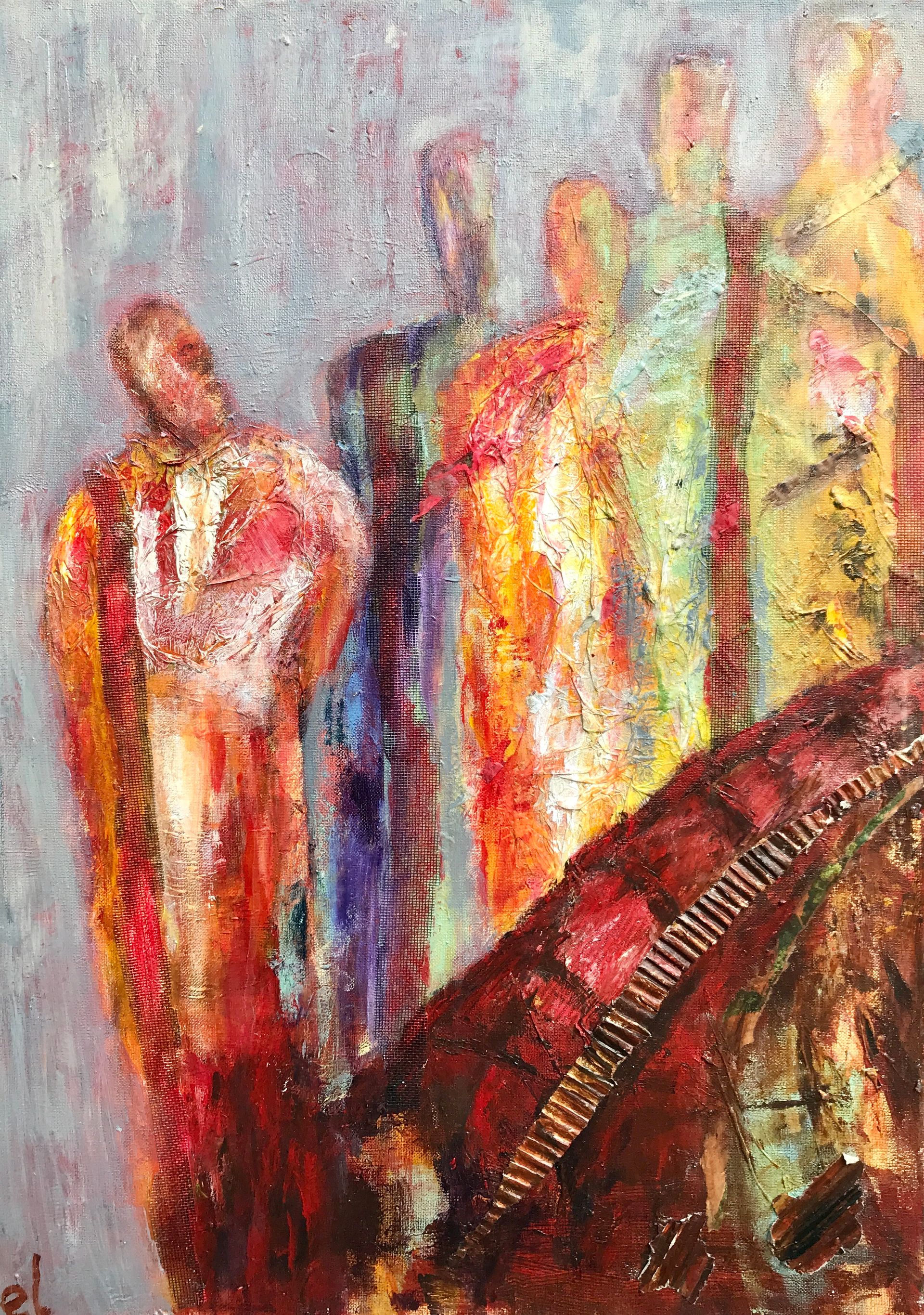 Ik werk redelijk intuïtief. Vaak start ik abstract met oog voor toetsvoering, kleur, vorm en compositie, maar zie op een bepaald moment mensfiguren verschijnen en werk daar dan op door.