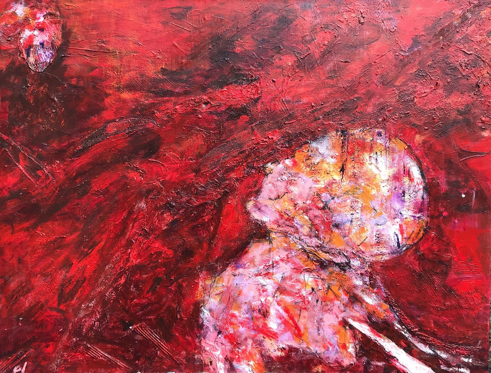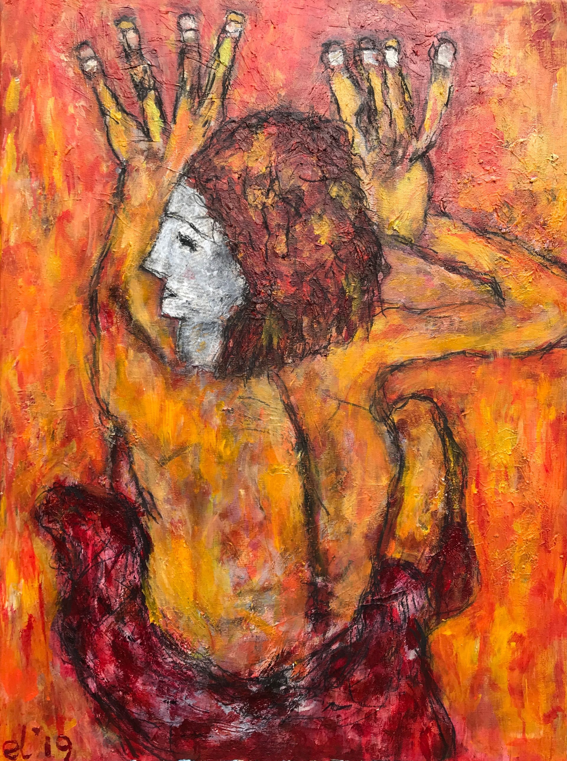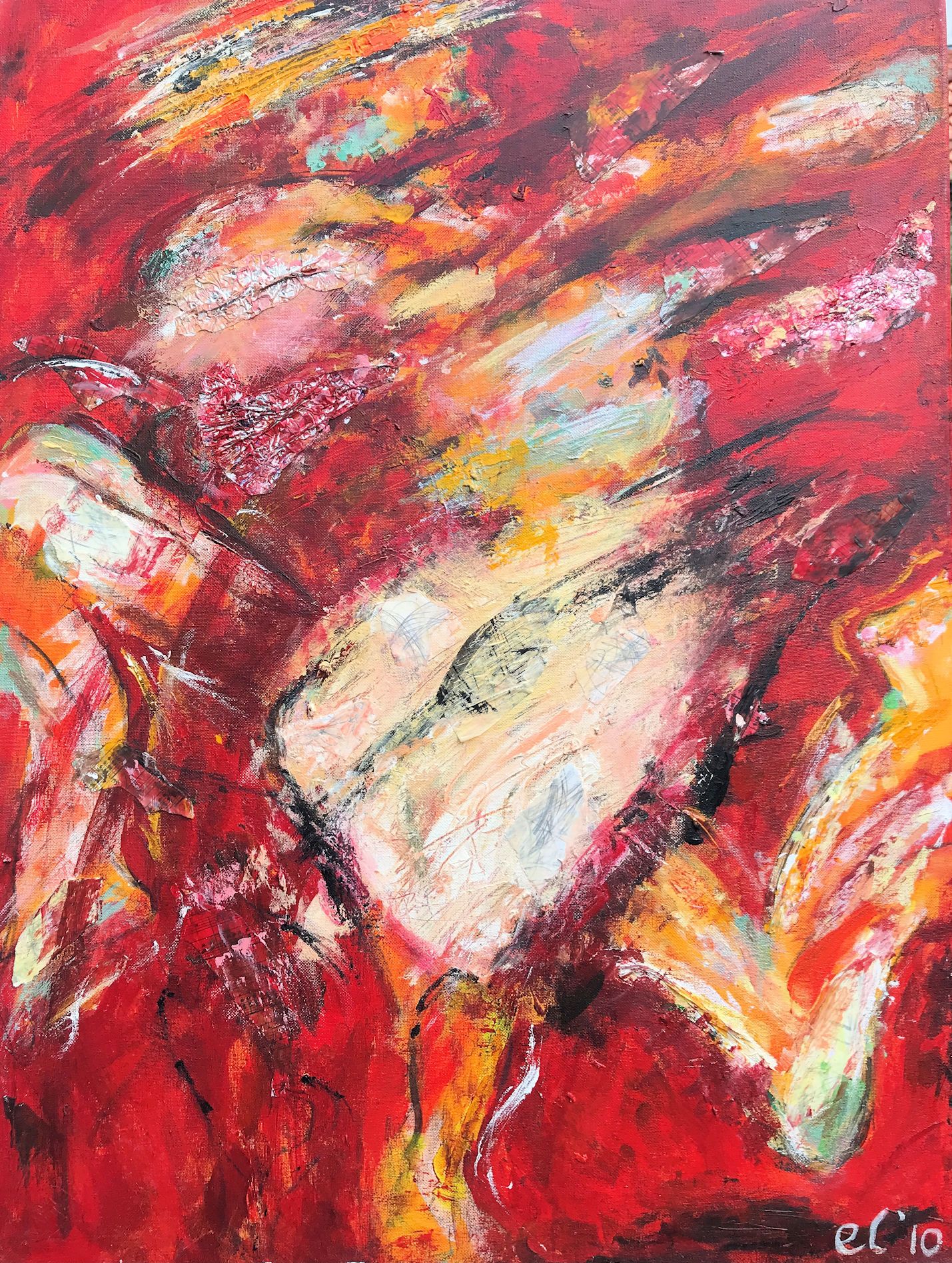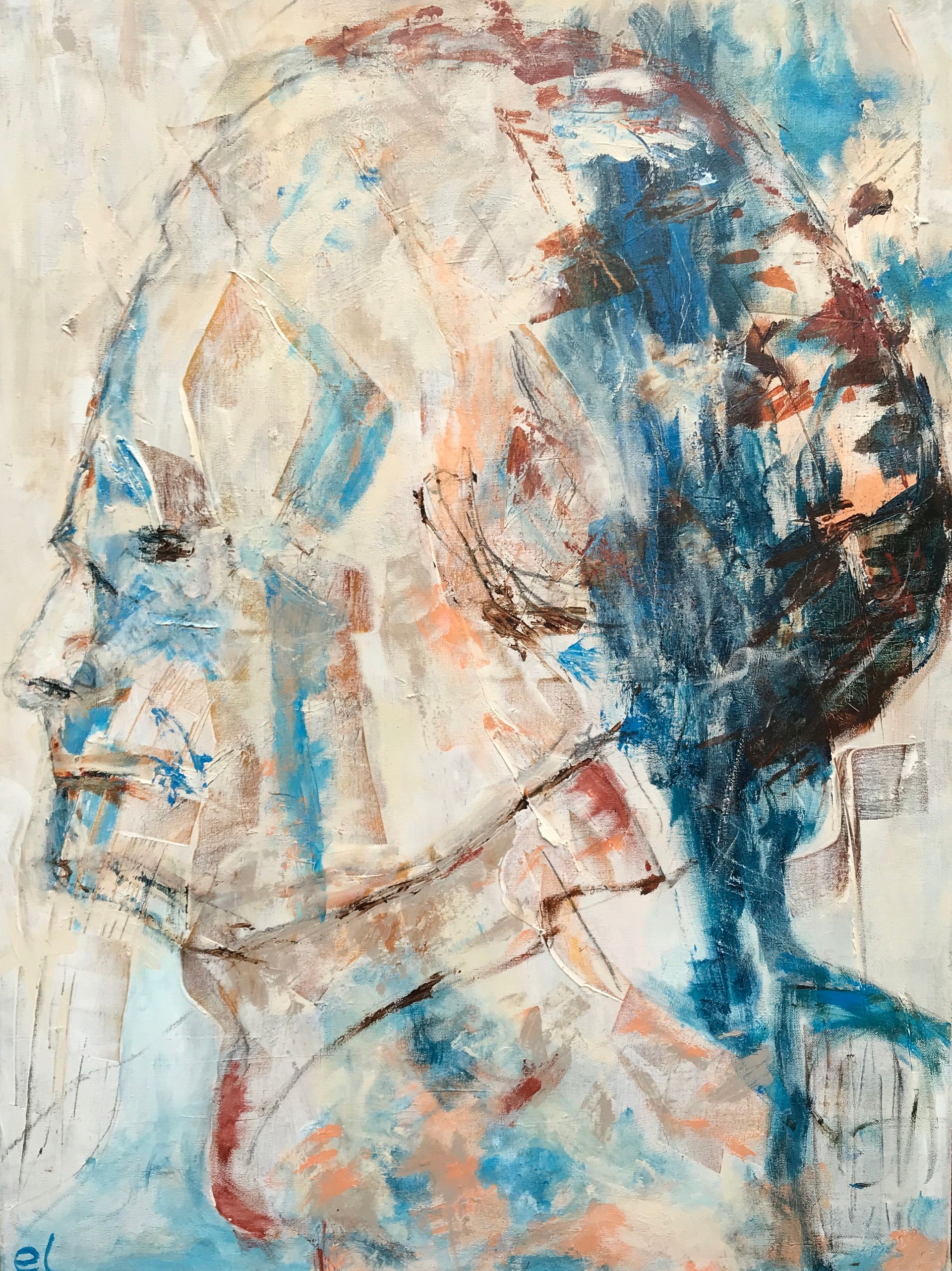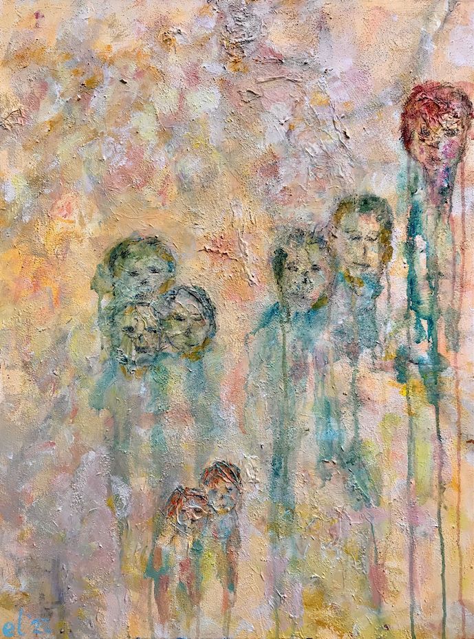 Ik werk redelijk intuïtief. Vaak start ik abstract met oog voor toetsvoering, kleur, vorm en compositie, maar zie op een bepaald moment mensfiguren verschijnen en werk daar dan op door.