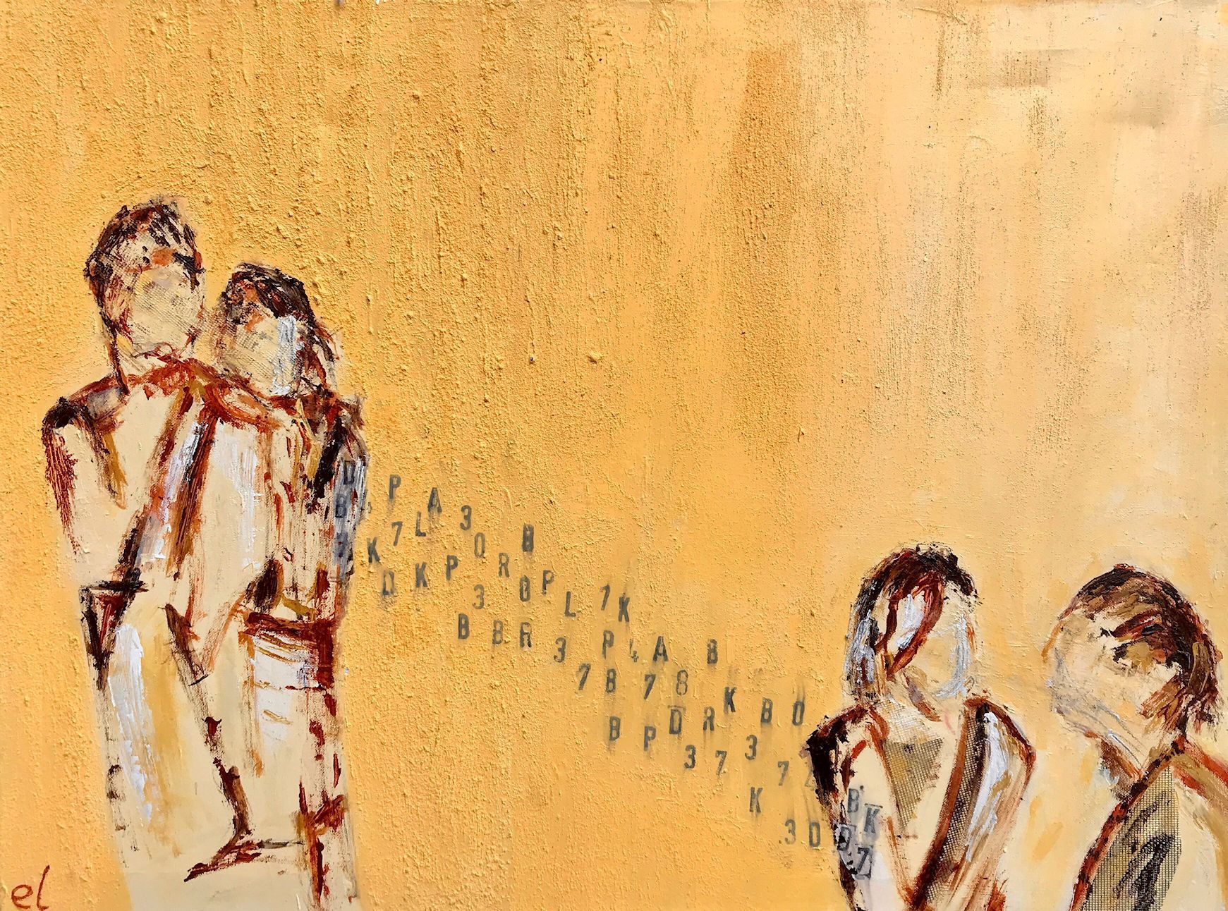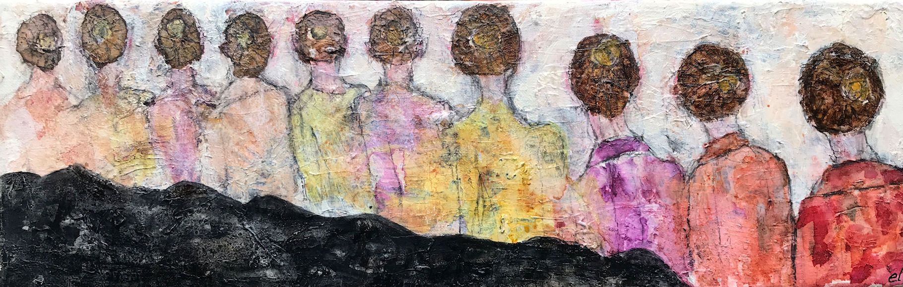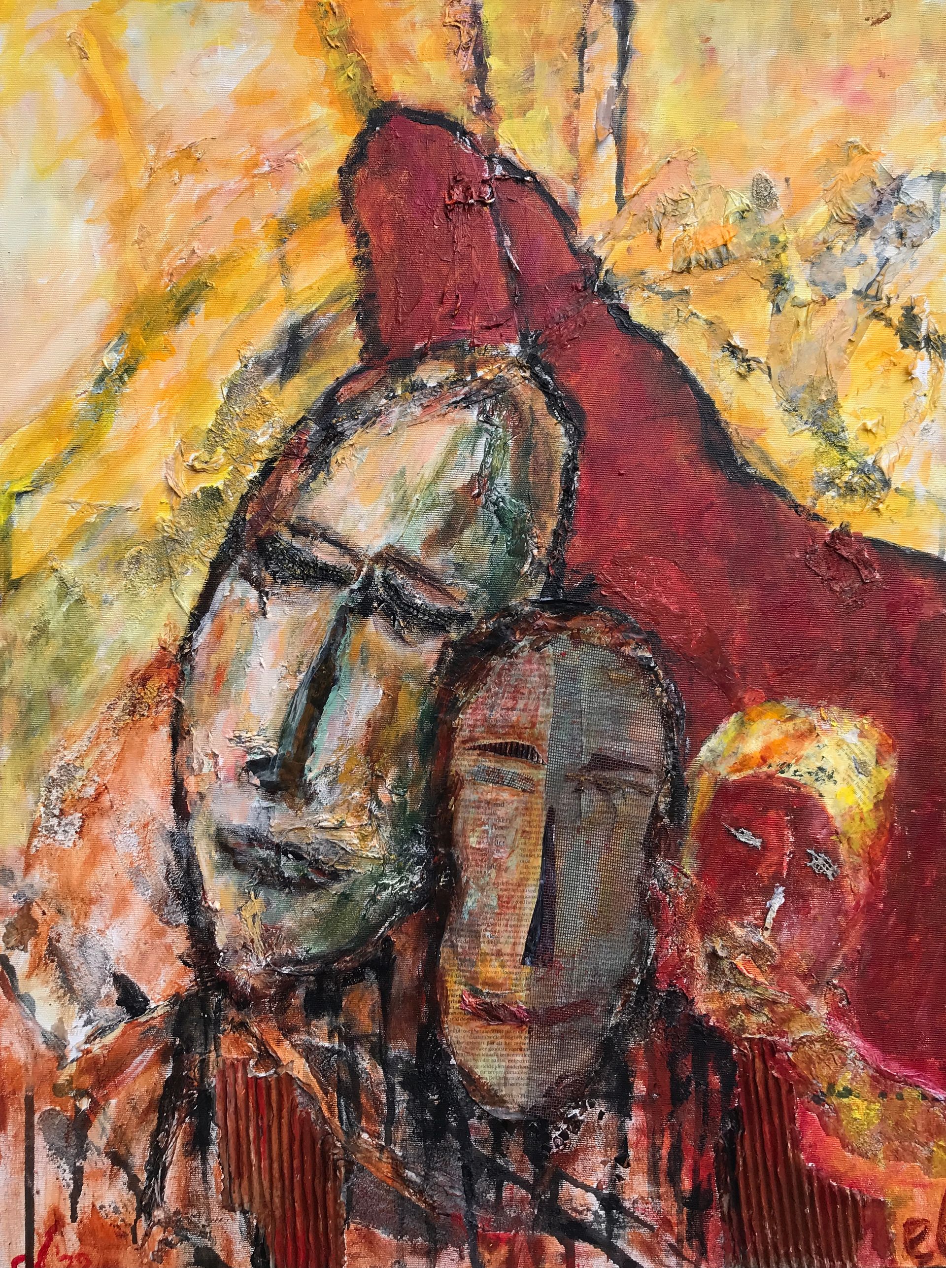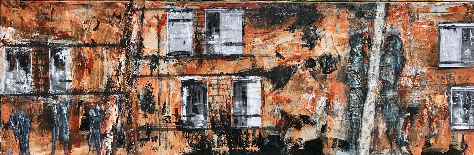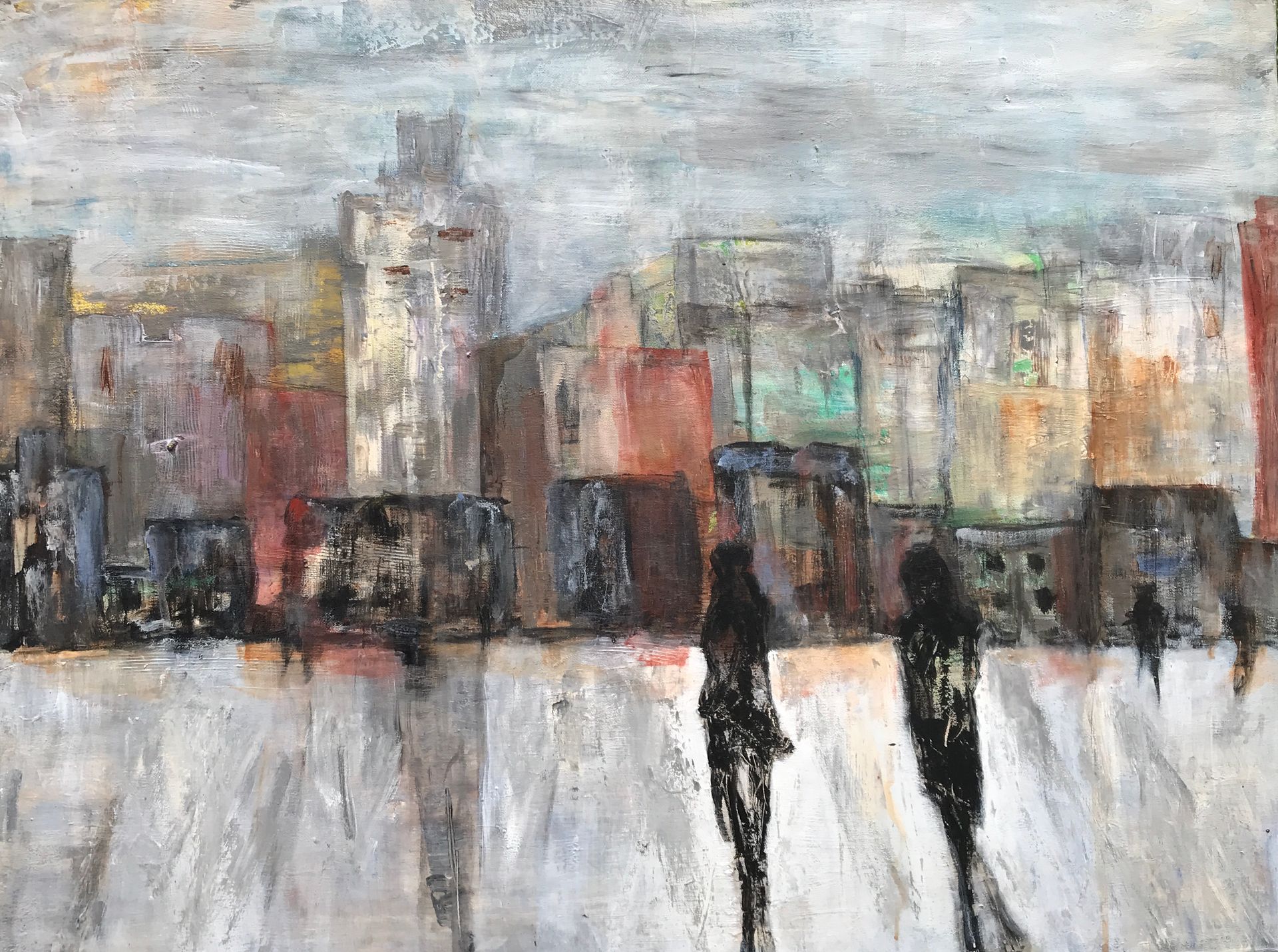 Ik werk redelijk intuïtief. Vaak start ik abstract met oog voor toetsvoering, kleur, vorm en compositie, maar zie op een bepaald moment mensfiguren verschijnen en werk daar dan op door.