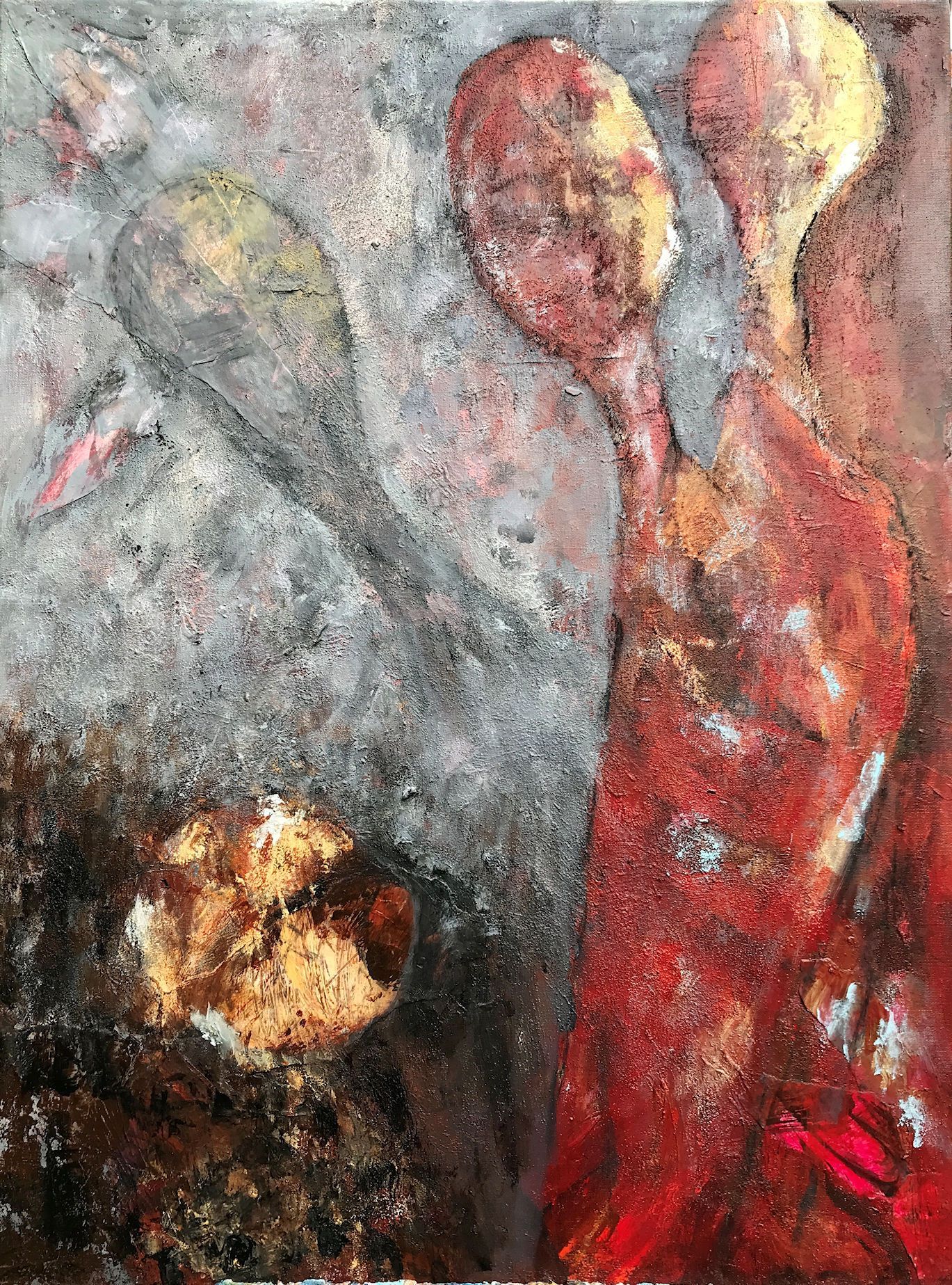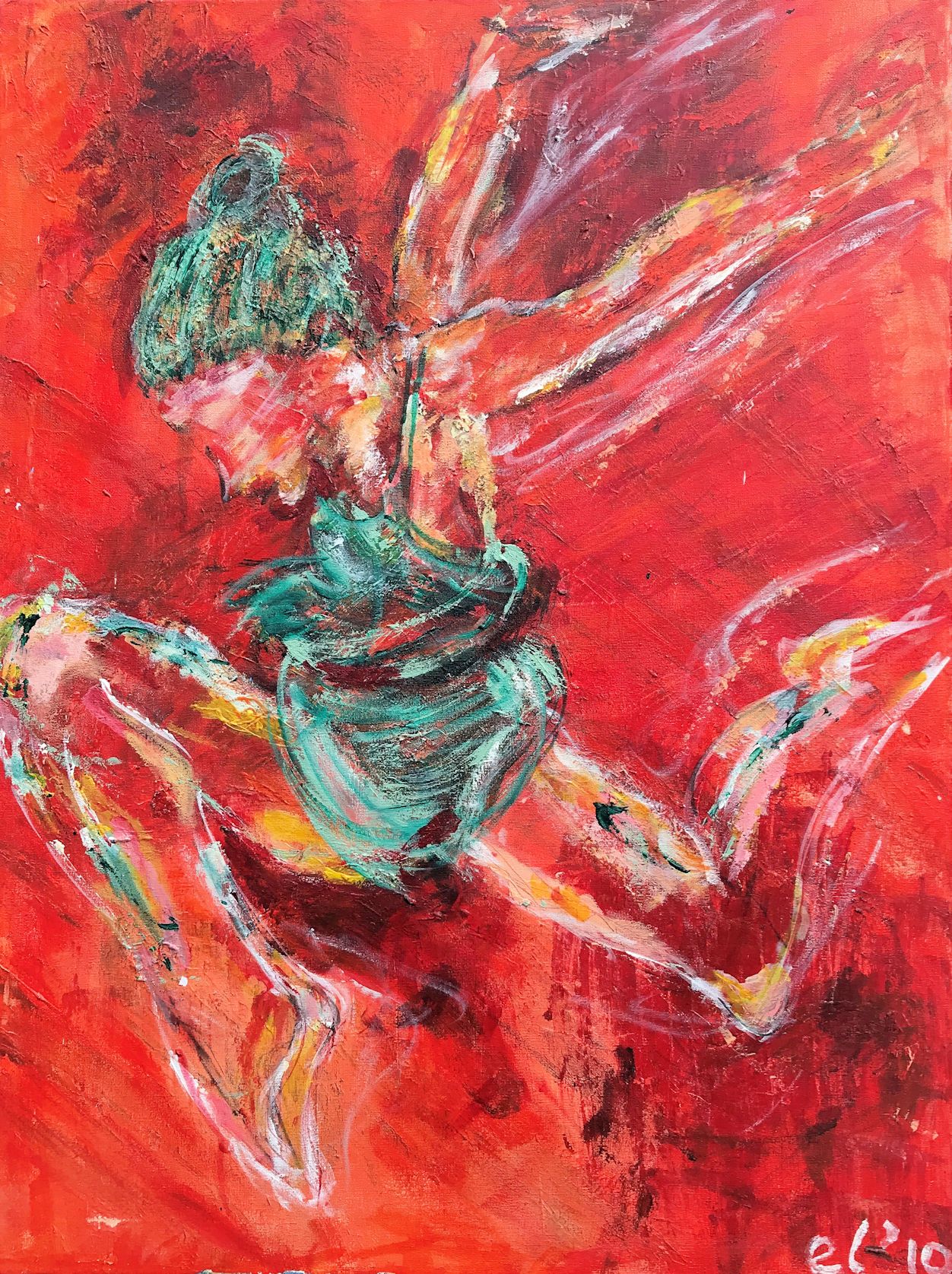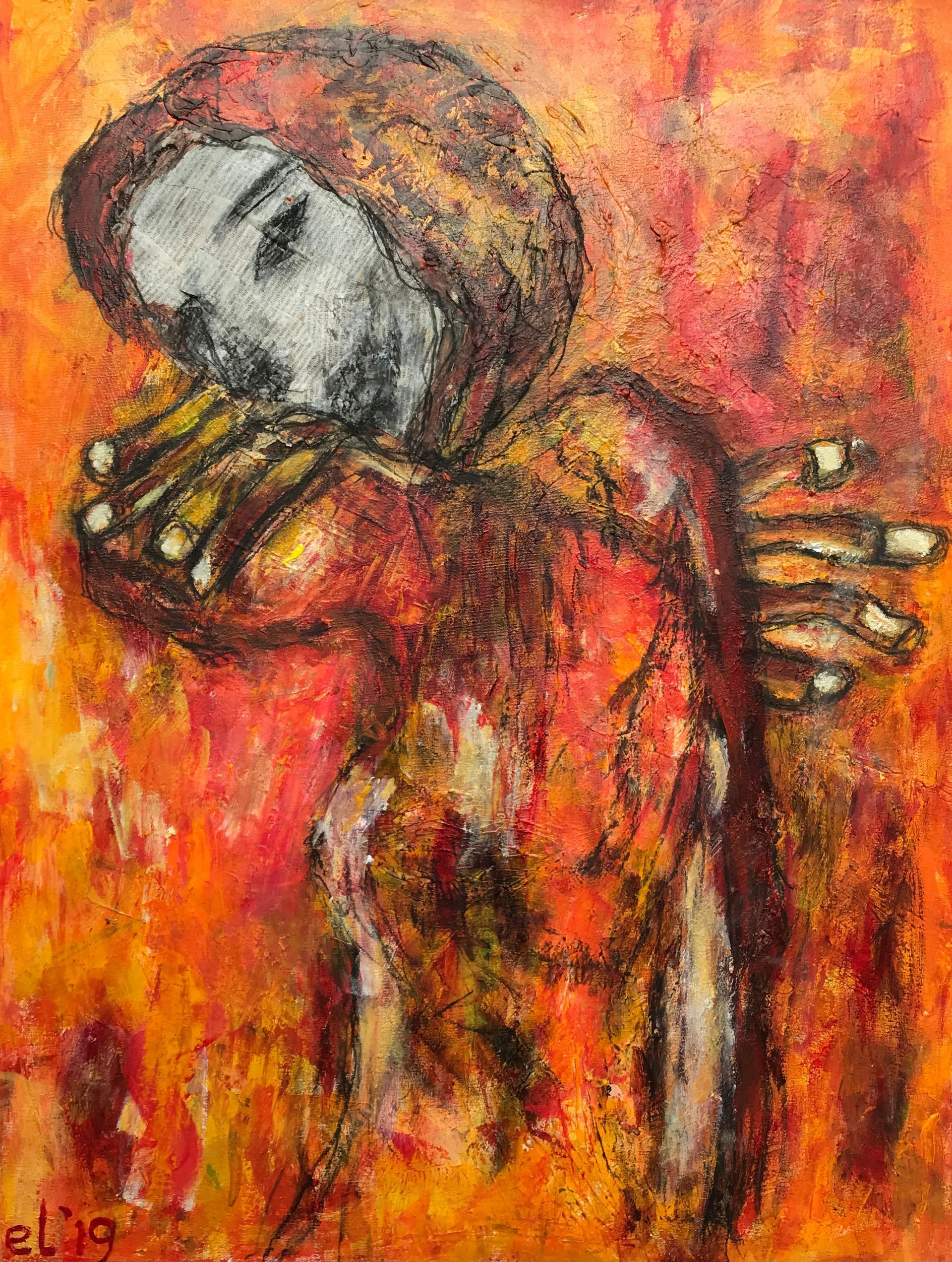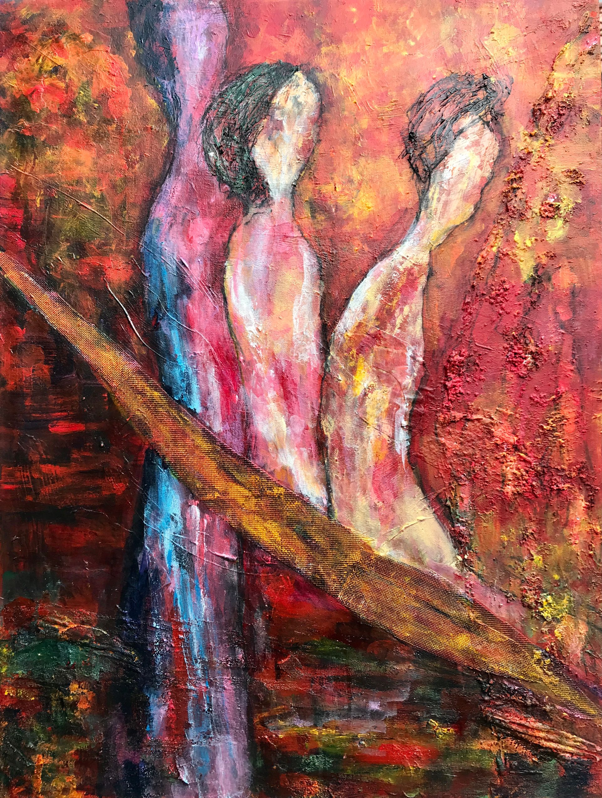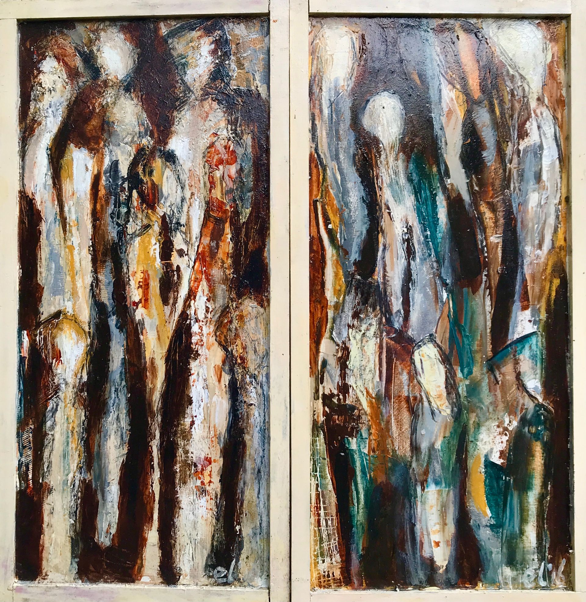 Ik werk redelijk intuïtief. Vaak start ik abstract met oog voor toetsvoering, kleur, vorm en compositie, maar zie op een bepaald moment mensfiguren verschijnen en werk daar dan op door.