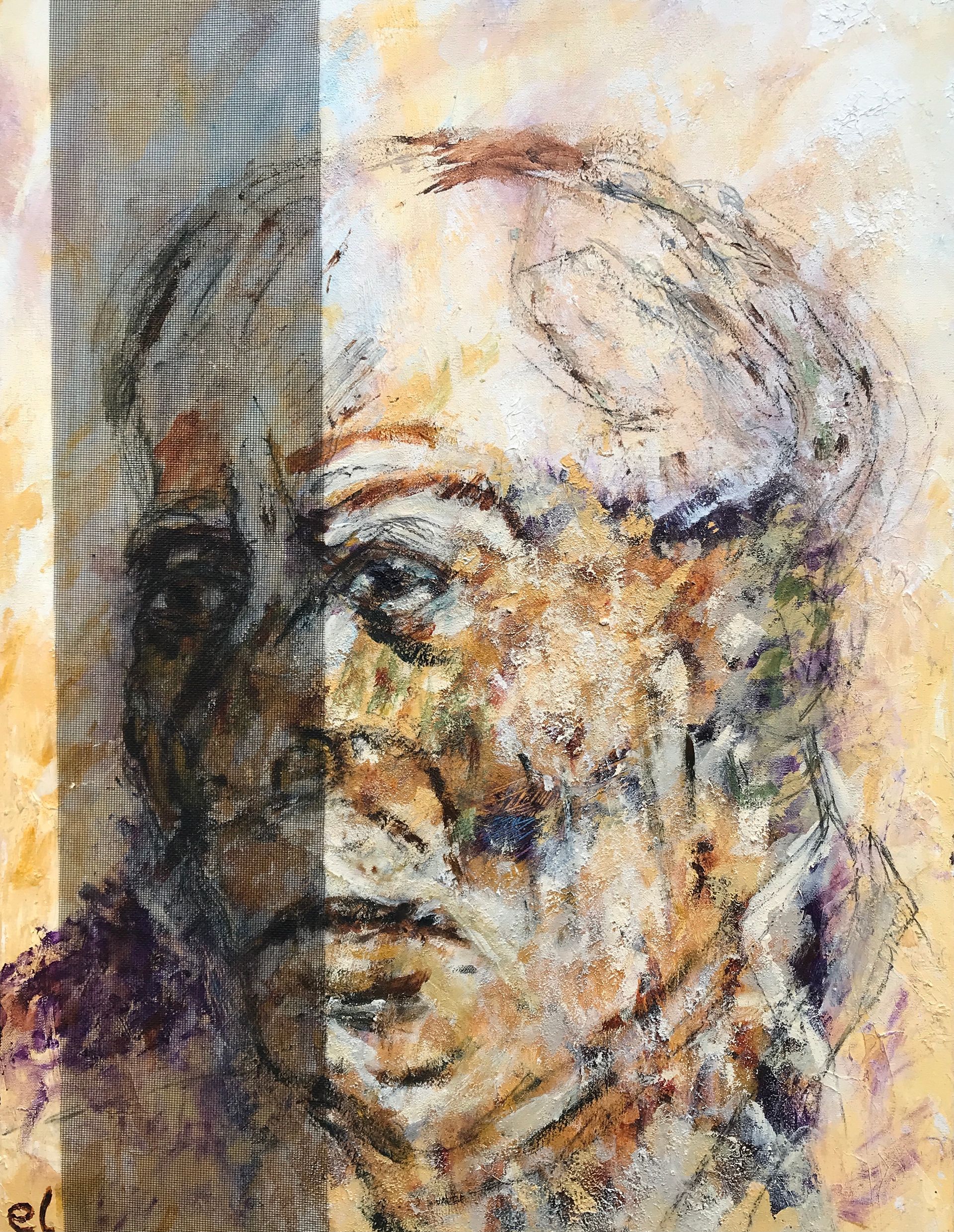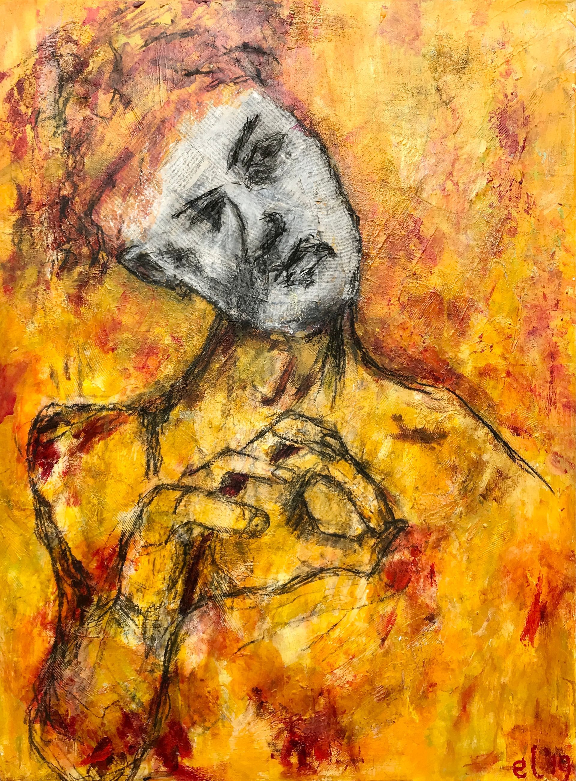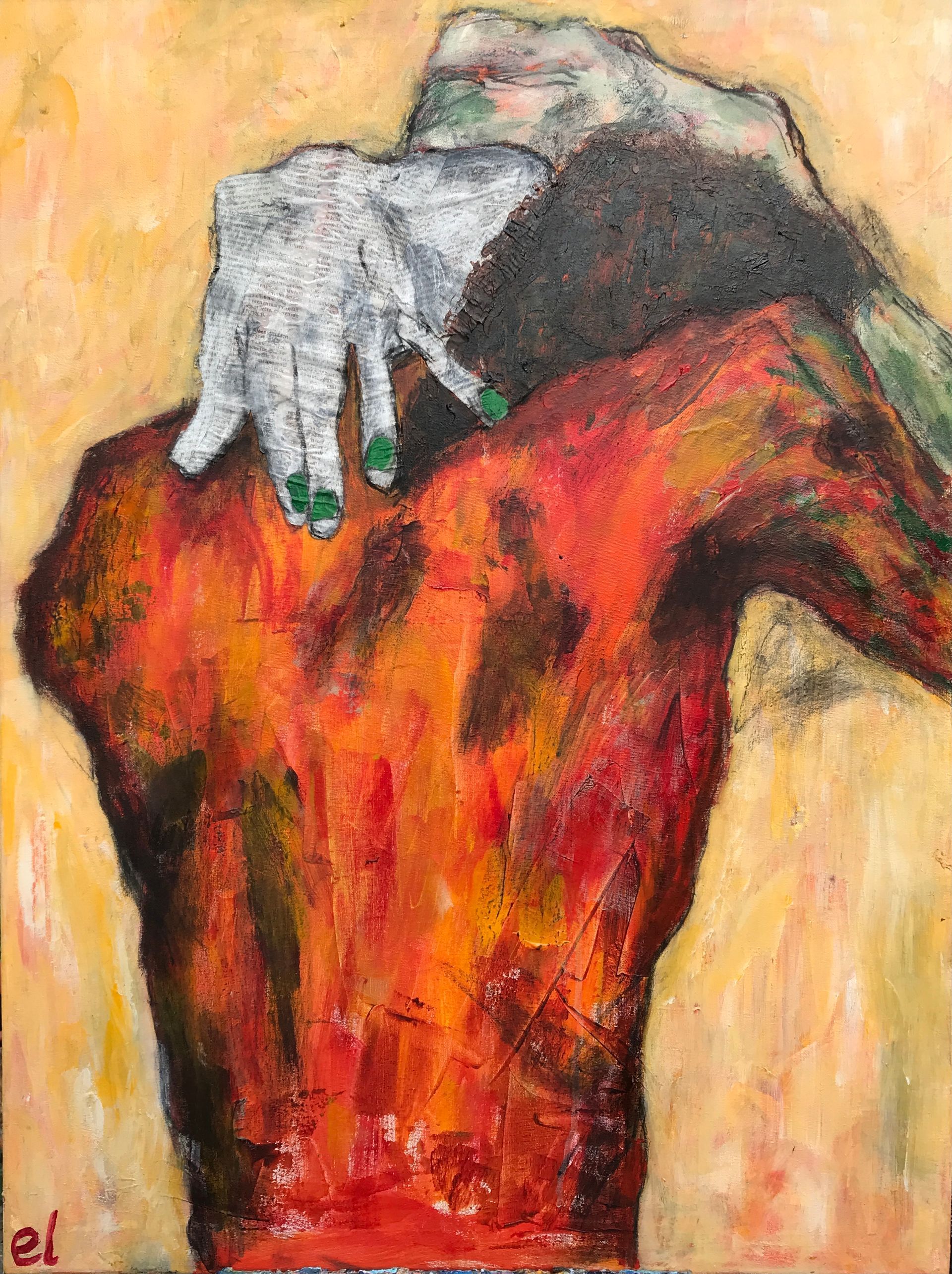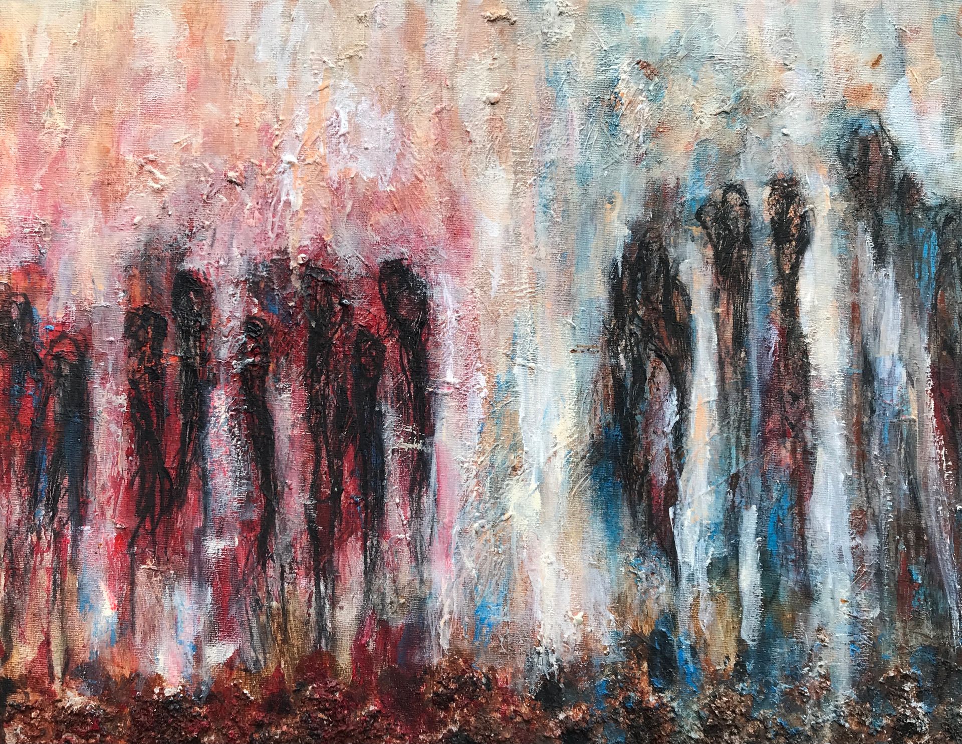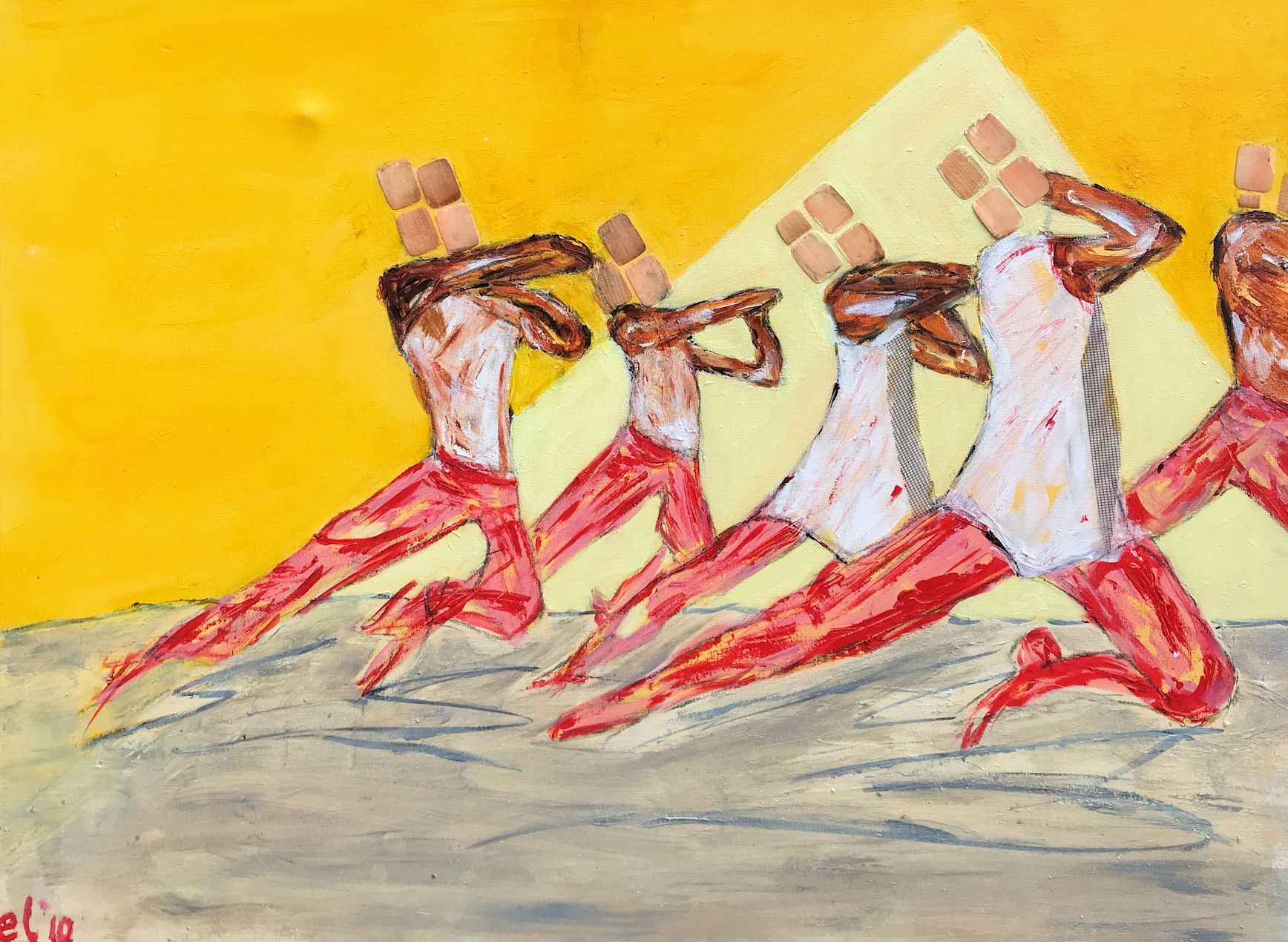 Ik werk redelijk intuïtief. Vaak start ik abstract met oog voor toetsvoering, kleur, vorm en compositie, maar zie op een bepaald moment mensfiguren verschijnen en werk daar dan op door.
