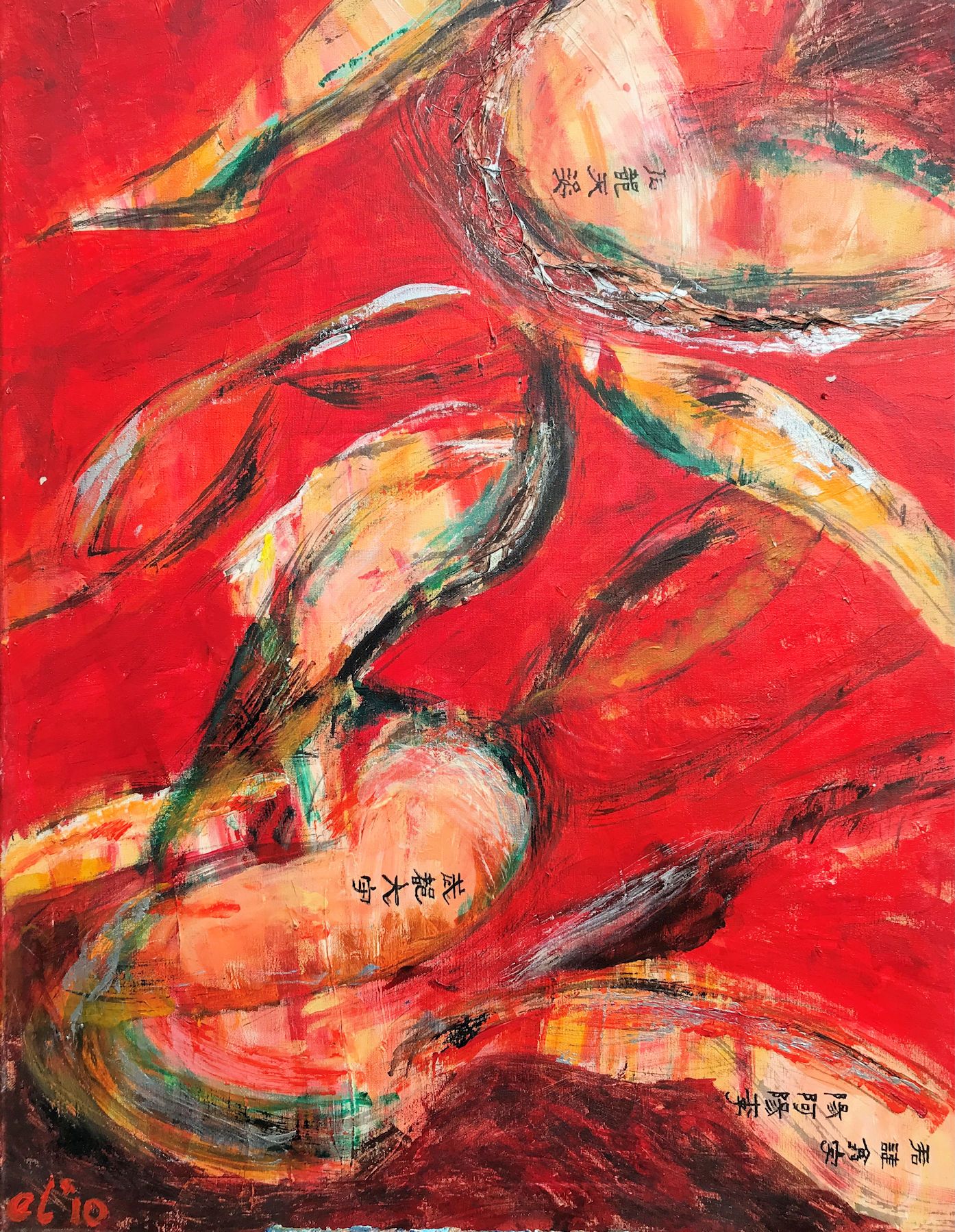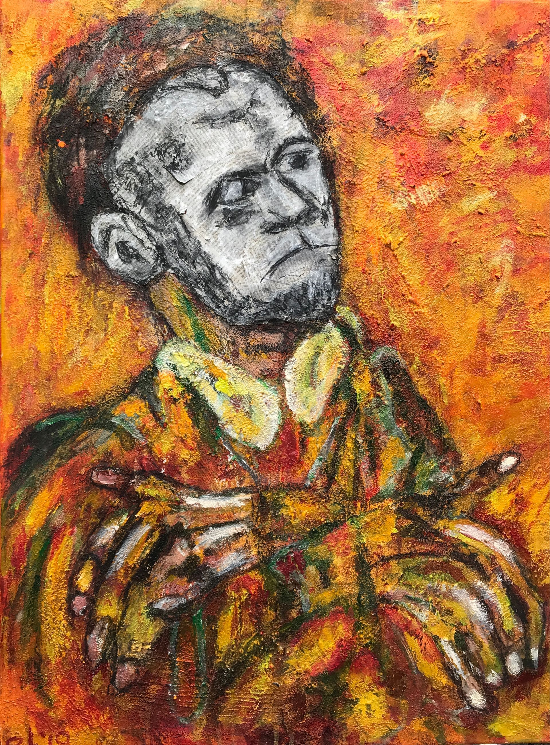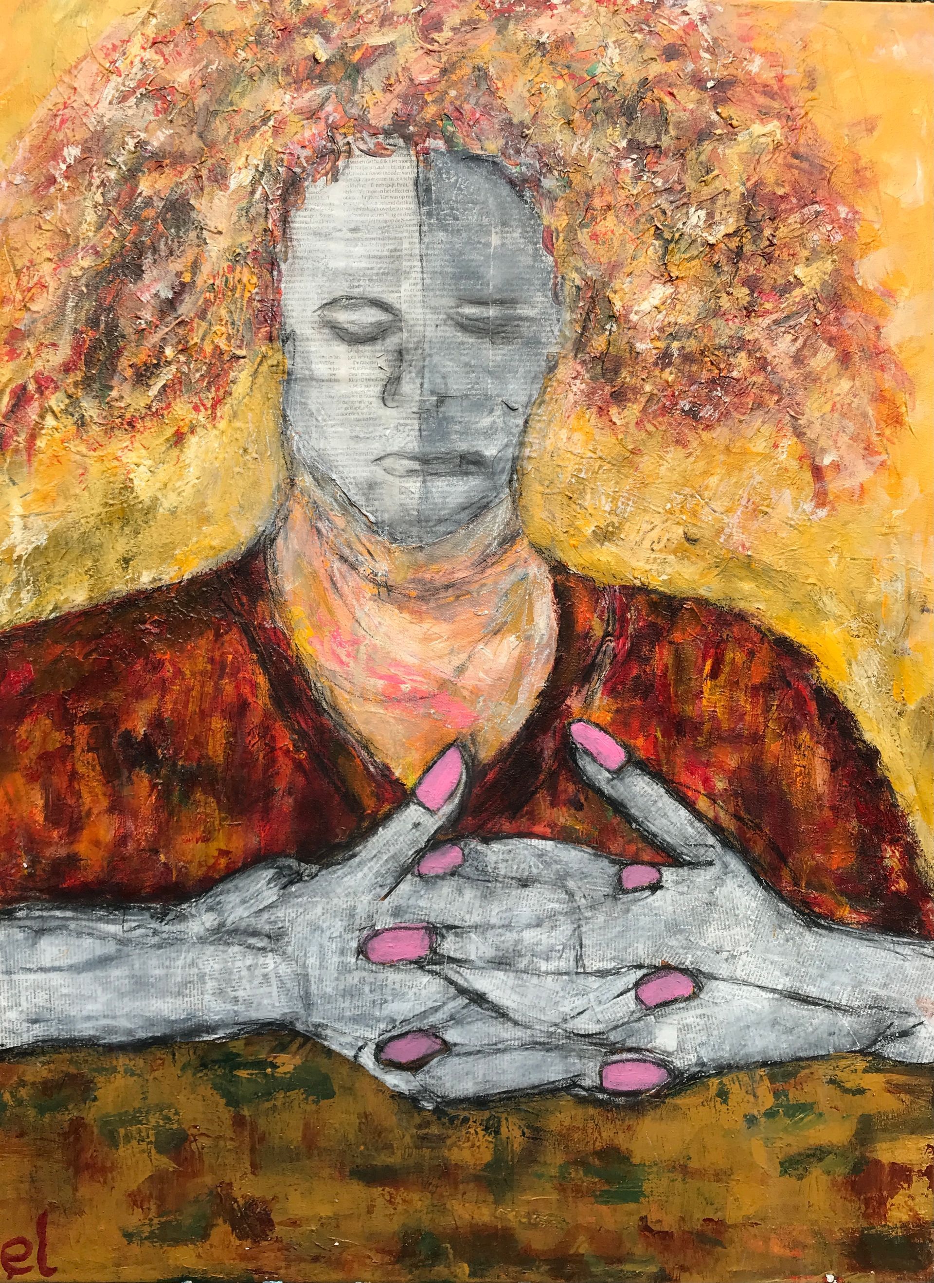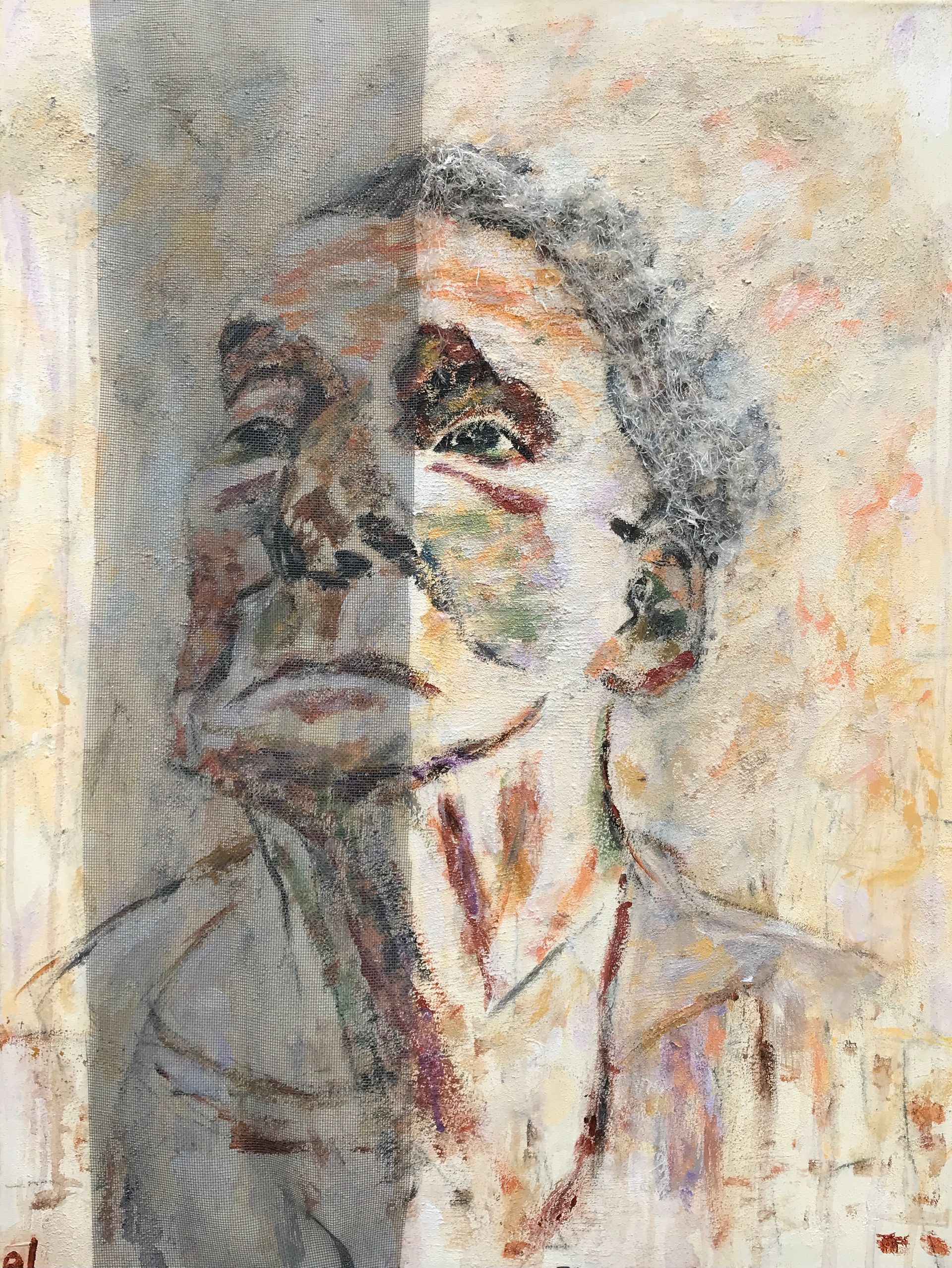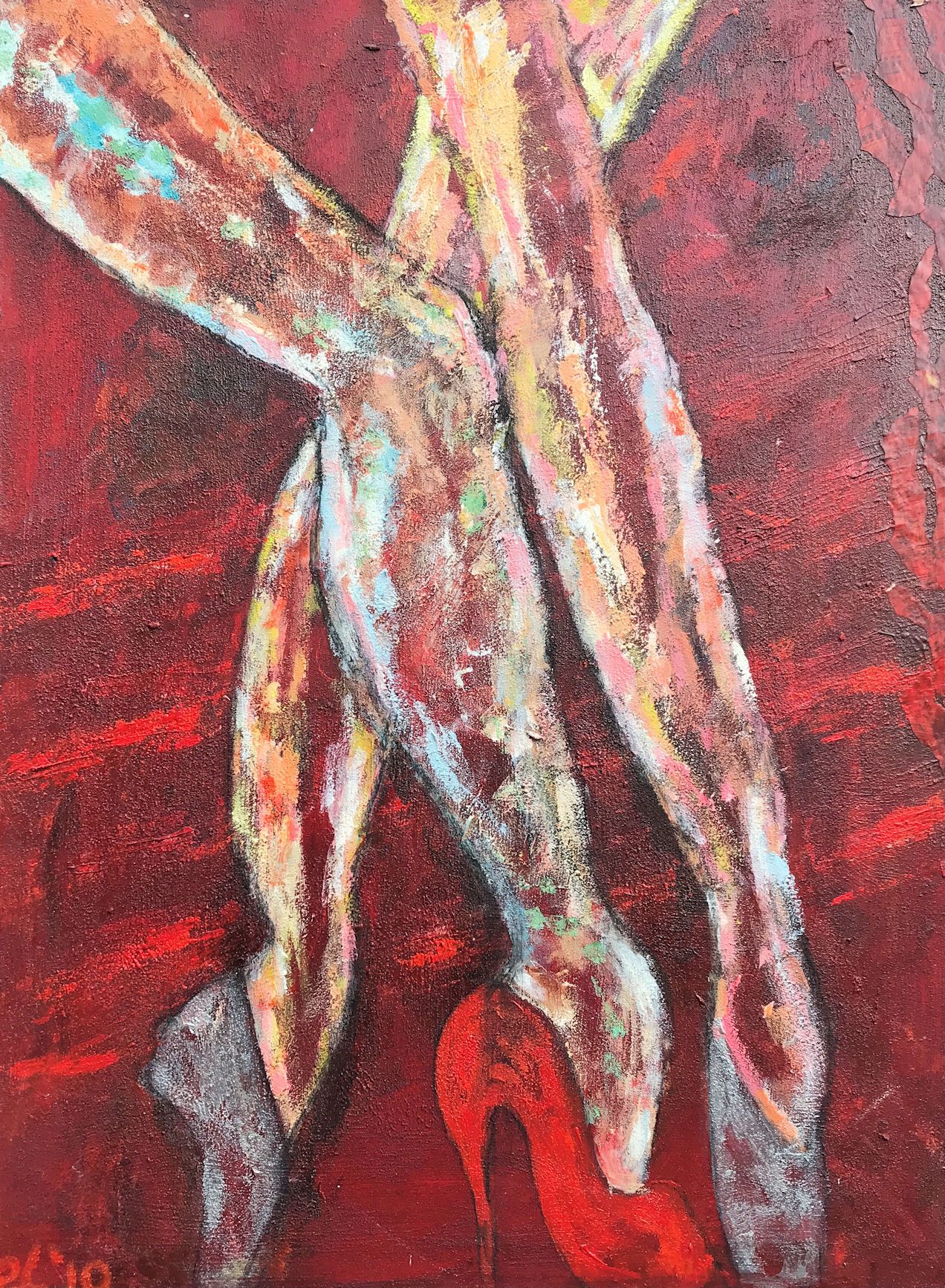 Ik werk redelijk intuïtief. Vaak start ik abstract met oog voor toetsvoering, kleur, vorm en compositie, maar zie op een bepaald moment mensfiguren verschijnen en werk daar dan op door.