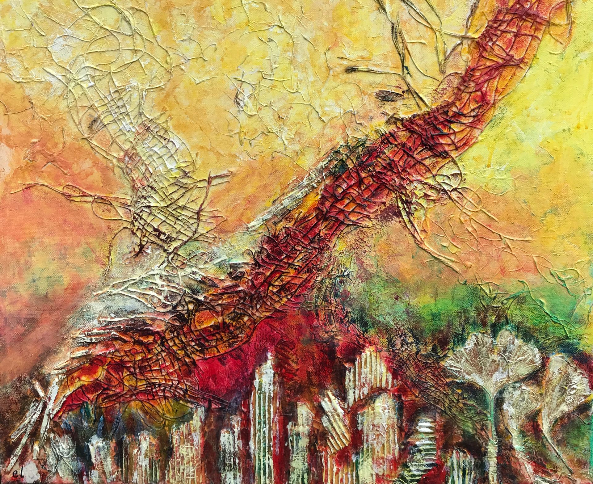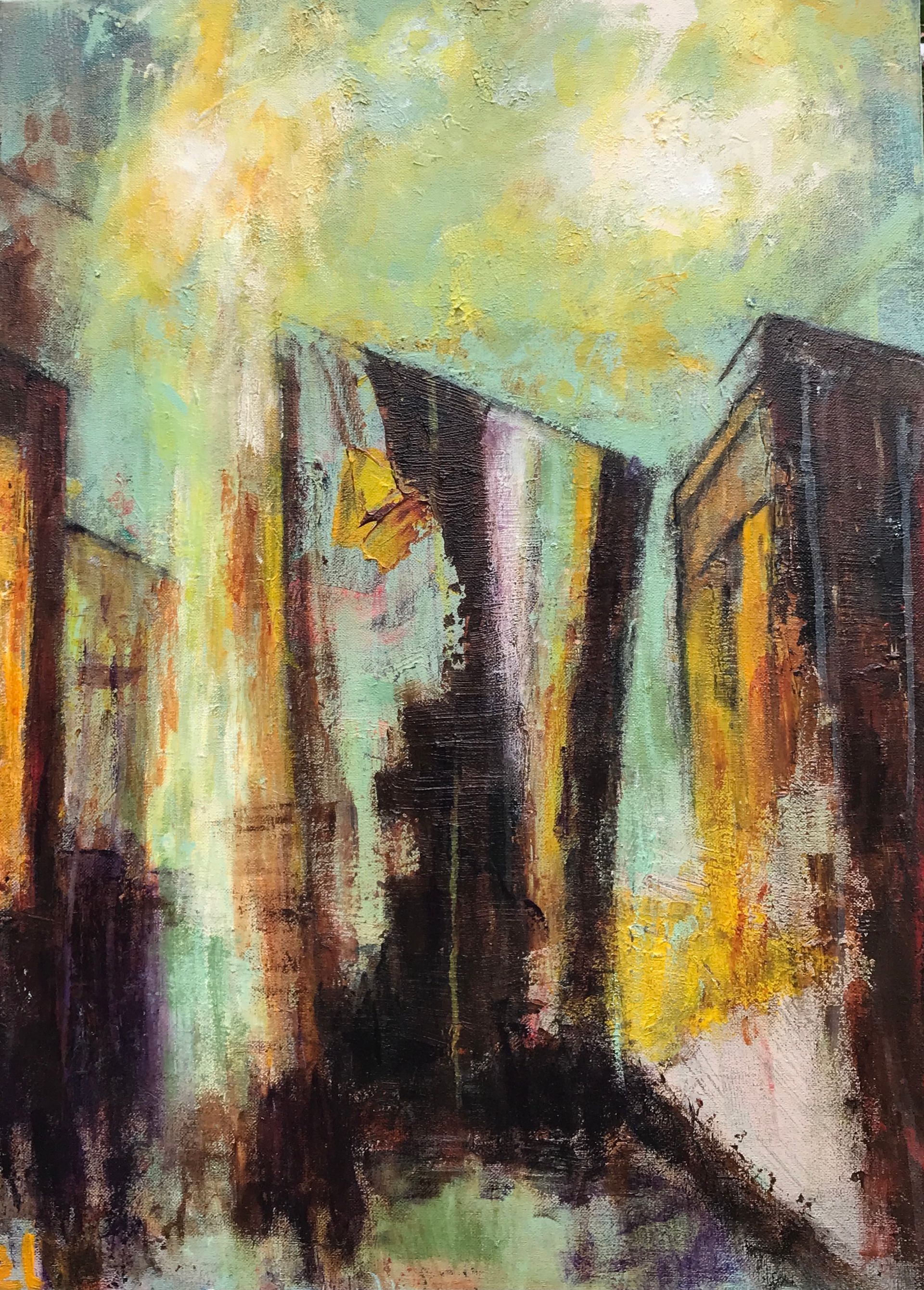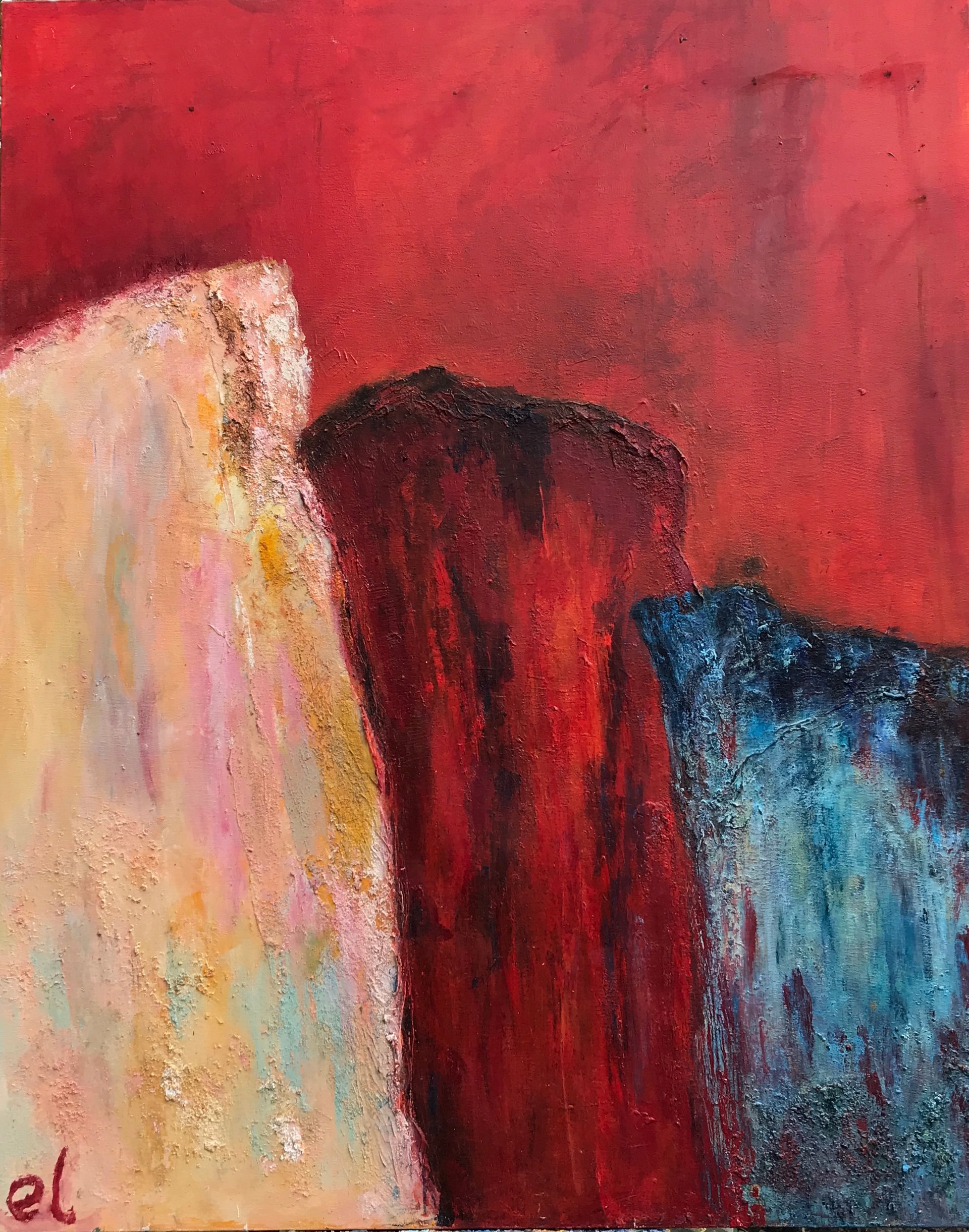 Ik werk op schilderdoek met acrylverf en gebruik veel het paletmes. Ik maak graag gebruik van textuur, b.v. zand, zout, ribbelkarton, krantenpapier en gaas.