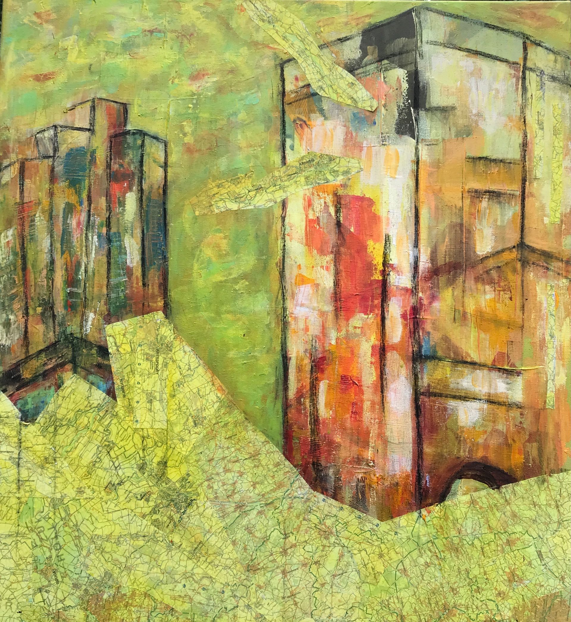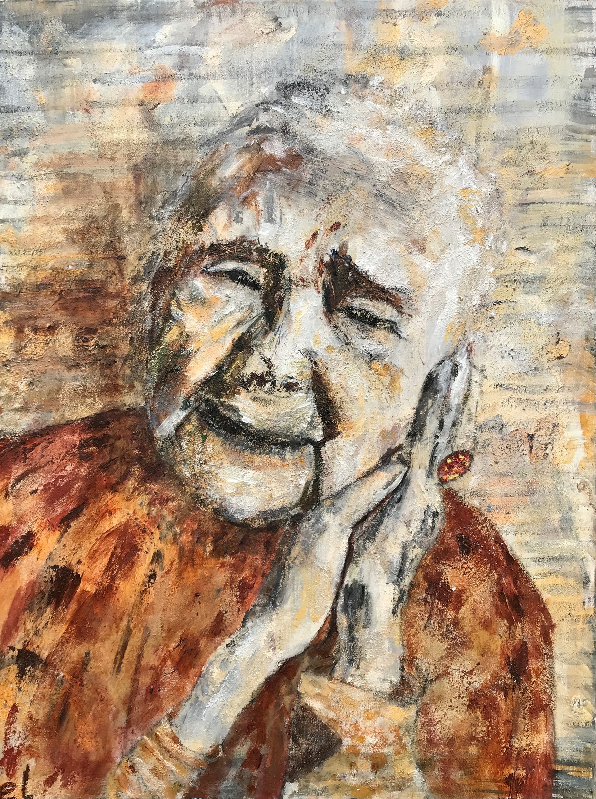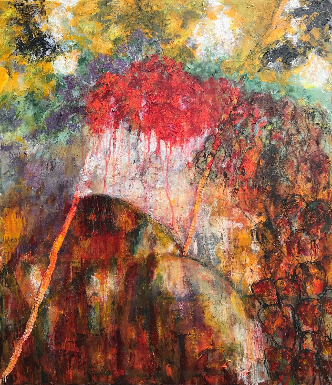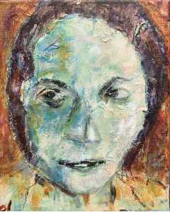 Ik werk op schilderdoek met acrylverf en gebruik veel het paletmes. Ik maak graag gebruik van textuur, b.v. zand, zout, ribbelkarton, krantenpapier en gaas.