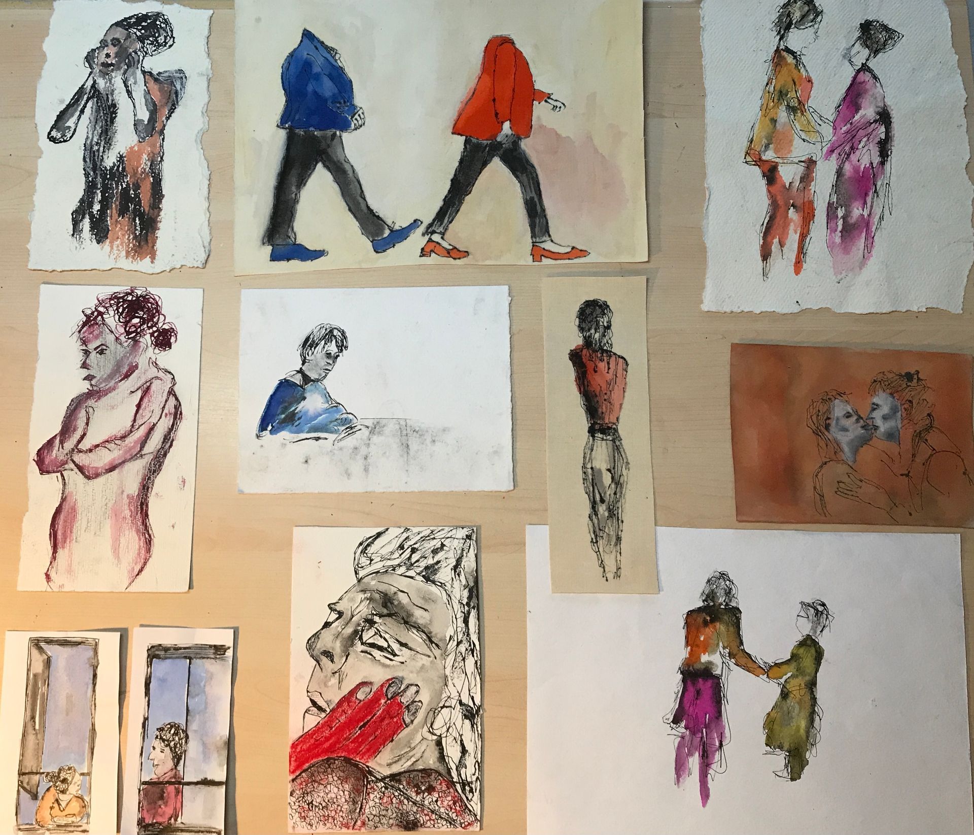 Ik probeer vaak lijnen spontaan te houden en het schetsen met schilderen te combineren.